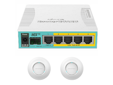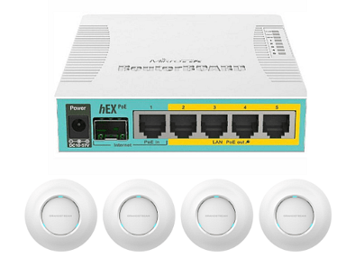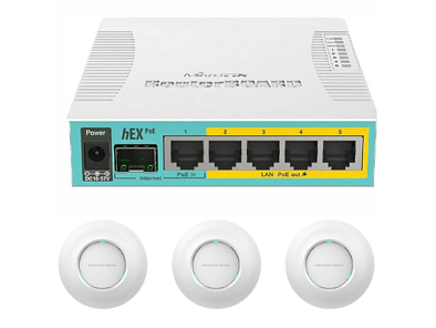 Powerfull MikroTik hEX gigabit router and dual band Grandstream 7630 4×4:4 MU-MIMO 802.11ac wave2 Access Points with cloud management and full wifi control. Band selection for each SSID, guest wifi, kids wifi, control of users and wifi time schedule. All controlled remotely from your smart phone (via an app).