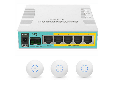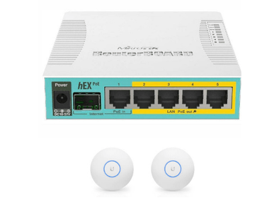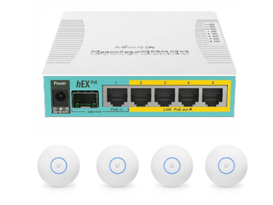 Powerfull MikroTik hEX gigabit router and dual band Ubiquiti UAP- U6 Lite (WiFi6) WiFi Access Points with cloud management and full wifi control. Band selection for each SSID, guest wifi, kids wifi, control of users and wifi time schedule. Option: All controlled remotely from your smart phone (via an app)(cloud controller will be installed if this option is chosen).